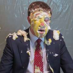 Piestooge was surprised by FormalWAM with a big sloppy cream pie to the face